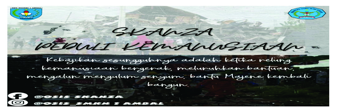 Kami, SMK Negeri 1 Ambal, mengadakan gerakan galang dana bertema “SKANZA PEDULI KEMANUSIAAN” yang dipelopori dan dikoordinir/dipanitia oleh Organisasi OSIS. Acara yang berlangsung kurang lebihnya 5 hari sedari Rabu, 20 Januari 2021 sampai dengan Minggu, 24 Januari 2021 ini, berhasil dilaksanakan, dengan melibatkan seluruh warga sekolah, dari siswa/siswi, bapak/ibu guru, karyawan/karyawati tak luput dari galang dana ini.
