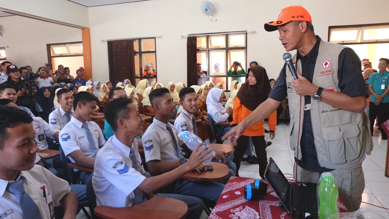 “Ayo siapa yang tahu bagaimana caranya menyelamatkan diri saat ada bencana tsunami?,” tanya Ganjar saat memberi materi di SMKN 1 Kebumen.